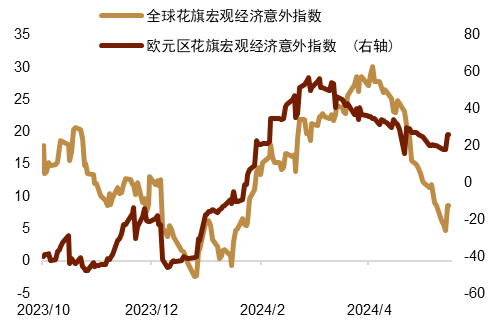 然而美元上行的总体空间受限和赔率不高 尽管套息交易对美元指数会有一定程度的支撑,但我们认为美元或不会重复2022年的那种强势,上行空间有限,赔率并不高。首先,套息交易的收益部分来源于息差,虽然短期内美联储降息的信号仍未出现,但数据也并不支持美联储短期内重启加息。市场目前对于美联储年内降息的预期已经降至50个基点左右,这已经小于3月美联储点阵图所隐含的程度(图表9)。因此,“更高更久”的相关交易对于美元利率的向上带动力是有限的。其次,做多美元的头寸已经较为拥挤。根据CFTC的外汇期货持仓数据,美元对主要货币的多头持仓水平已经达到多年以来的最高水平(图表10)。这意味着做多美元的交易已经处于偏拥挤的水平。在5月份,美元的多头已经有所削减,但仍处于高位。我们认为,多头的拥挤交易或限制美元的上行空间。再次,非美国家的经济预期好转,利率上行限制了美元的利差优势。今年第一季度,欧洲地区的经济表现超出了市场预期,其基本摆脱了去年下半年以来陷入技术性衰退的担忧。进入二季度之后,欧元区的综合PMI仍处于扩张区域,显示经济仍处于复苏通道中。尽管欧央行早于美联储降息[2],但我们认为经济的复苏意味着欧央行的降息总幅度或比目前市场预期得更少,这有利于欧元区长端利率的稳定。除了欧洲以外,英国CPI的超预期粘性则让英国央行的降息时间点后置,这也支撑了英镑的利率和汇率。因此,欧美和英美的利差水平并没有因为美联储的降息预期后移而显著拉开,这也会限制美元指数的短期涨幅。我们认为,美元指数短期内或不会脱离2023年以来的波动区间。