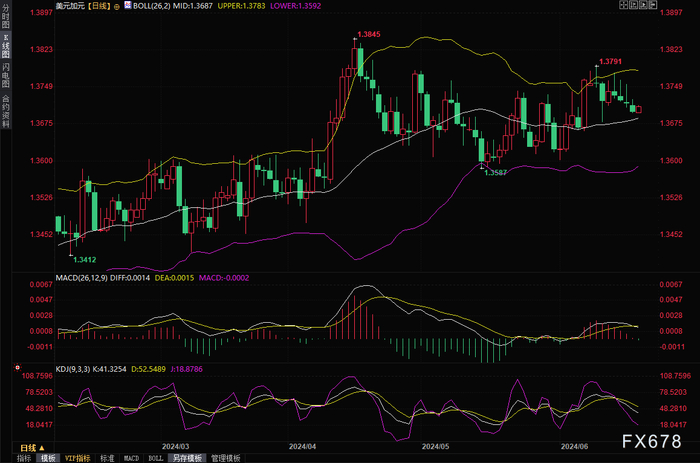 美元/加元汇率由于美联储 (Fed) 的降息路径存在不确定性, 加元走势平缓,兑其最大货币——美元 (USD) 的汇率窄幅波动,但稳守关键支撑位1.3700。目前看来,加元资产出现盘整,原因是美联储的预测与市场对今年降息幅度的预期存在分歧。美国市场因六月节假期而休市,投资者关注周五的美国采购经理人指数 (PMI) 数据,导致市场交易量减少。