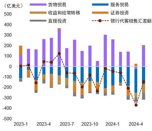 5月外汇市场供求改善有限 5月银行代客涉外收付款逆差约2.5亿美元,代客结售汇逆差约143.3亿美元,逆差规模均较4月收窄,外资持有银行间市场债券环比增加1,724亿元,较4月进一步扩大。涉外收付款方面,5月录得逆差约2.5亿美元,明显低于4月的381.8亿美元,主因是涉外支出规模的明显收窄(图表10)。分币种看,人民币对外付款支出环比减少约8.1%,分项目看,资本与金融项目对外付款环比减少约9.4%。人民币跨境收支趋于平衡或是涉外收付款逆差减少的重要原因。代客结售汇方面,5月逆差约为143.3亿美元,较4月的366.5亿美元明显收窄,主因在于经常项目逆差明显收窄。货物贸易结售汇由逆差22.5亿美元转为顺差194.9亿美元,服务贸易逆差由223.9亿美元收窄至165亿美元(图表11)。5月结汇率边际走高,然而依旧处于近年来同期较低水平(图表12)。