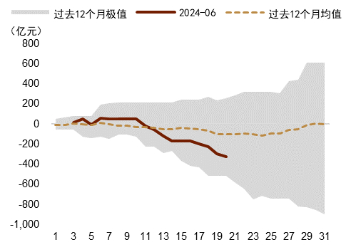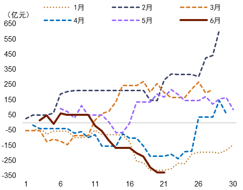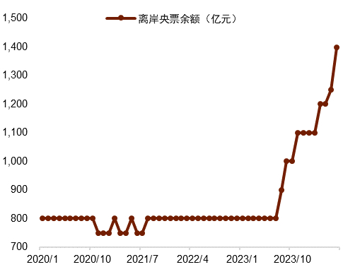 央行或将坚持稳汇率政策 随着市场预期压力的增加,我们认为稳汇率政策发力的迹象在上周更加明显。央行官员继续强调“防范人民币汇率超调”,金融时报也强调“央行坚决稳汇率的决心”。在第十五届陆家嘴论坛上,潘功胜行长提及[1]“我们坚持市场在汇率形成中的决定性作用,保持汇率弹性,但同时强化预期引导,坚决防范汇率超调风险”。朱鹤新副行长表示[2]“未来我们将继续高度关注外部环境变化,进一步充实用好政策工具箱,防范人民币汇率超调和异常跨境资金流动风险”。我们认为,央行表示“保持汇率弹性”或意味着后续人民币汇率仍有波动空间,强调“坚决防范汇率超调风险”或意味着汇率预期稳定依然是后续货币政策操作的重要考量。上周央行旗下官媒金融时报报导称[3],在港常态化发行离岸人民币央票,释放了强化离岸人民币流动性调节、稳定人民币汇率的重要政策信号,表明央行坚决稳汇率的决心,有利于稳定外汇市场预期。具体来看,央行在6月19日发行了共计200亿元6个月期限的央行票据。考虑到6月21日将到期50亿元的离岸人民币央票,此次新增发行150亿元央行票据,离岸央票未到期余额增至1,400亿元,创历史新高(图表5)。