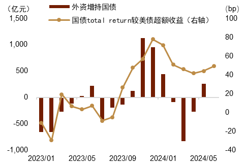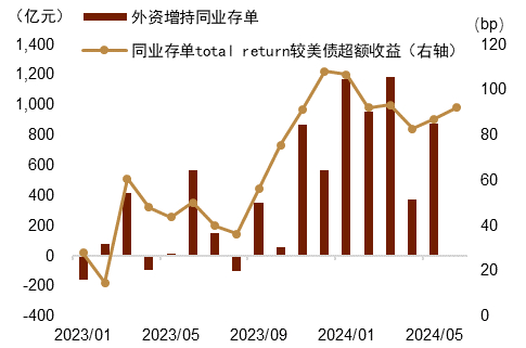 5月境外机构持有银行间市场债券环比增加约1,724亿元,创年内次高。外资持有同业存单、政金债、国债分别增加879.9亿元、513.3亿元和253.2亿元。我们发现由于近期人民币汇率保持了相对稳定,一年期USDCNY掉期隐含利差持续走高,目前已超过4%(图表13)。由此带来的汇兑收益增厚了持有美元的境外机构通过掉期增持人民币债券的总收益。在稳汇率政策持续的背景下,同业存单(图表14)及国债(图表15)的总收益在6月进一步增加,我们认为,短期内外资有望继续流入境内债券市场。