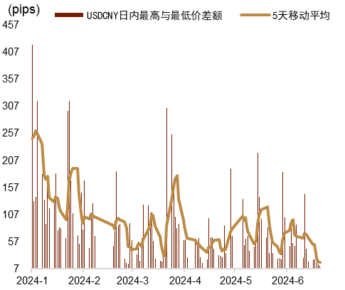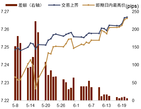 从外汇市场运行来看,上周随着人民币汇率走弱压力增加,稳汇率政策明显发力。首先,上周中间价进一步成为人民币汇率向上波动的显性约束,有三个工作日的即期汇率日内高点距交易上界不足10 pips(图表6),逆周期因子调节规模进一步扩大(图表7)。其次,离岸人民币流动性趋紧,TN远期点数的20日移动均值小幅上移(图表8)。再次,上周人民币日内最大波动空间(日内最高价减去最低价)收窄至20 pips以内,人民币波动空间短期内或受限于稳汇率政策(图表9)。最后,彭博上周五报导称[4],中资大行直接卖出美元以抑制人民币汇率的进一步走弱。
