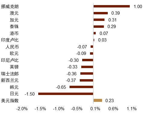 美元指数上周连续第3周走高,但总体涨幅并不大。主要货币对美元有涨有跌,波幅基本在1%以内。虽然美国零售销售数据的回落一度带动了美债利率和美元的走低,但之后PMI数据的超预期走强以及美联储官员们不急于降息的表态使得美元上周最终扭转了跌势。非美货币上周表现分化,原油价格的连续第二周走高支撑挪威克朗,加元表现较好,挪威央行则鹰派按兵不动并且称明年之前不会降息,两者分别收涨1%和0.31%,同样受益于央行鹰派按兵不动的还有澳元,上周澳大利亚央行连续第五次维持现金利率4.35%,但重申不会排除加息的可能,澳元最终收涨0.39%;欧元上周受制于较弱的PMI数据,上周最终小幅收跌0.1%左右,而英国5月通胀同比增速降至2%(低于前值的2.3%),此后英国央行虽然符合市场预期维持利率不变,但暗示更多票委或支持降息,市场对英国央行8月开启降息的概率有所上升,受此影响的英镑上周最终收跌0.33%。而考虑到瑞郎最近的持续升值,瑞士央行上周年内第二次降息,瑞郎最终收跌0.36%。日元是上周唯一跌幅超过1%的G10货币,日本央行缓慢的紧缩节奏令套息交易继续流行,日元上周跌至年内低点160附近,全周收跌1.5%。同样受到套息交易的影响,人民币汇率承压跌至年内低点附近。