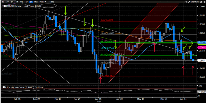 关注美国PCE数据 欧元/美元上周再次失守1.07附近这一支撑位置,短期内欧元空头可能依旧占据上风。本周市场重点关注美国的PCE数据,考虑到5月CPI和PPI的回落,如果核心PCE可以再次确认美国通胀进一步有所放缓,那么美元近期上涨势头可能放缓,而欧元则可能获得一定支撑。