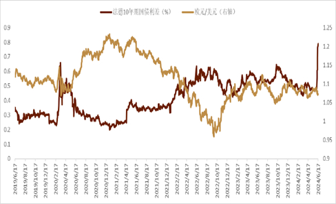 关注法国政坛动态对欧元的影响 上周欧元的低位震荡以及依旧处于高位的法德10年期国债利差可能说明市场对法国政坛的不确定性依旧有所顾忌(图表18),而根据上周末彭博最新的民调统计显示[8],马克龙所代表的复兴党的支持率仅有20%左右,依旧落后于偏右翼党派国民联盟(支持率33.9%)以偏左翼的新流行党(new popular front,支持率27%);在6月末首轮选举结果落地之前,法国政坛的不确定性可能依旧会使得欧元承压。