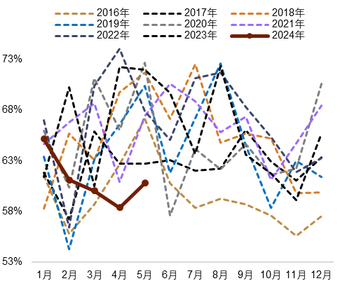 5月经济增长整体偏缓,“双新”政策发力支持消费与投资 5月经济数据整体表现偏弱,房地产市场下行压力依然较大,内需修复依然偏缓。消费方面,社零总额同比增长3.7%,高于彭博一致预期的3.0%和前值的2.3%,季调后环比增长约0.5%,处于今年来同期较高增速,或是假期消费等季节性因素支撑。投资方面,固定资产累计增速4%,低于彭博一致预期及前值的4.2%,主因或是房地产开发投资增速的持续偏低和基建投资增速的放缓。房地产方面,房地产开发投资增速-10.1%,弱于彭博一致预期的-10%和前值的-9.8%。销售端,商品房销售面积、商品房销售额分别录得-20.3%、-27.9%,工程端,房屋新开工面积、施工面积、竣工面积等累计同比分别录得-24.2%、-11.6%和-20.1%。我们认为5月房地产行业整体继续承压,这可能对市场风险情绪有一定压制,稳地产政策优化效果或还有待进一步观察。