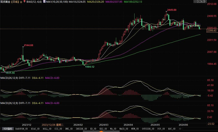 现货黄金日线图北京时间6月27日8:35,现货黄金报2299.31美元/盎司