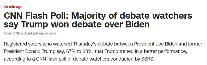 根据SSRS对辩论观察员进行的美国有线电视新闻网(CNN)快速民意调查,观看了周四拜登和特朗普辩论的登记选民表示,67%比33%的选民认为特朗普的表现更佳。
