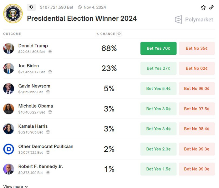 Polymarket数据发现,特朗普的胜率触及68%的历史高位,远远超越了拜登。