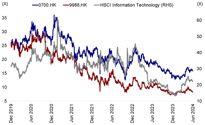 图表:港股互联网板块以及部分重点个股估值过去三年明显回落