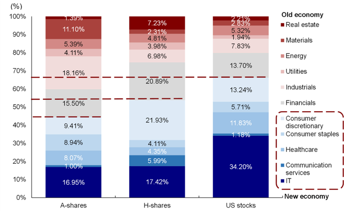 图表:相比A股,港股新经济占比更高,当前从盈利层面更加具备比较优势