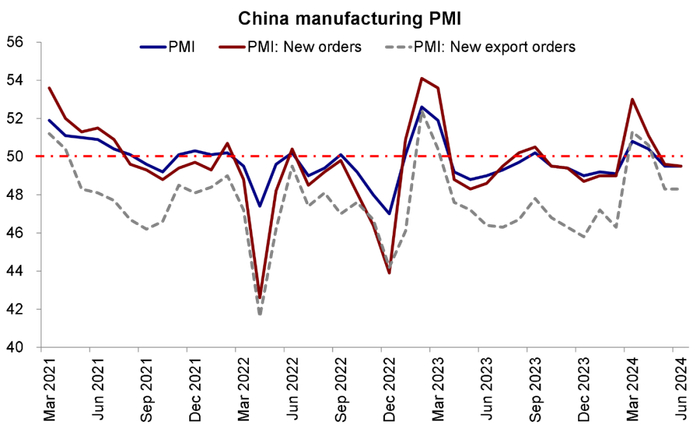 2) 6月中国制造业PMI为49.5%与上月持平。2024年6月中国制造业PMI为49.5%,与上月持平连续两个月处于收缩区间,体现制造业景气度仍然偏弱。其中生产指数仍高于临界点,但较上月下降0.2个百分点至50.6%。新订单指数较上月下降0.1个百分点至49.5%,体现制造业市场需求景气度略有下降。与此同时,非制造业PMI比上月下降0.6个百分点至50.5%,但仍高于临界点。