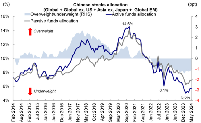 图表:全球各类型主动资金配置中资股比例已从2020年的14.6%降至当前的5.7%,并且低配1.1ppt