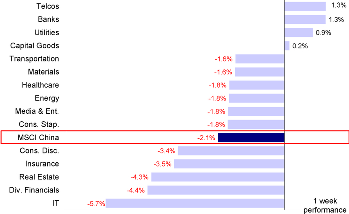上周港股整体承压,尤其周四由于汇率走弱以及分红税调整担忧下,恒生指数跌破18,000点关口。主要指数中,恒生指数与恒生国企分别下跌1.7%,MSCI中国下跌2.1%,成长板块占比较高的恒生科技压力更大,单周下跌4.0%。板块上,信息技术(-5.7%)、多元金融(-4.4%)以及房地产(-4.3%)等板块领跌,而通信服务与银行分别上涨1.3%,相对跑赢。