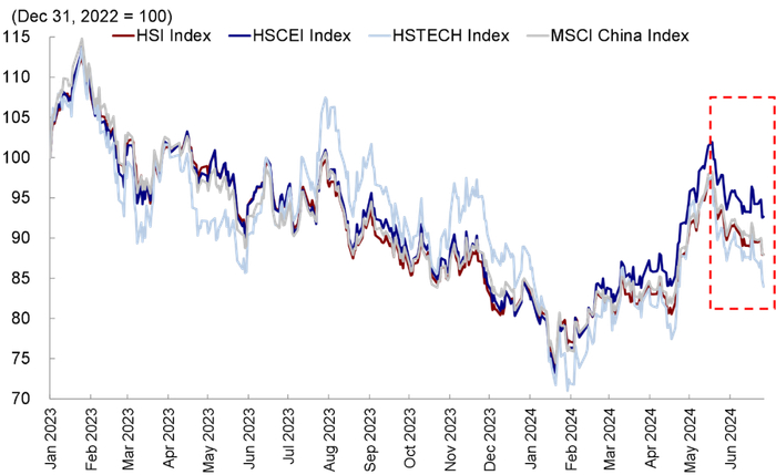 继前一周上证指数跌破3,000点大关后,恒指上周也失守18,000点关口。随着近期市场的持续回调,投资者情绪也愈发低迷,外资流出压力加大可能也加大了A股与港股的压力。除了情绪的低迷外,海外环境的变数也在增加,主要体现在降息前景和所谓的“Trump Trade”上。