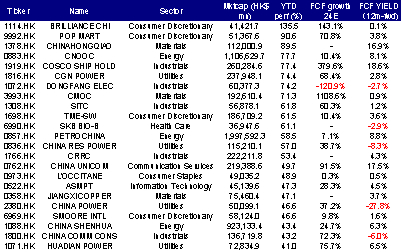 图表:年初以来300亿港元以上市值的标的中,表现最好的标的往往具备自由现金流充裕这一特点