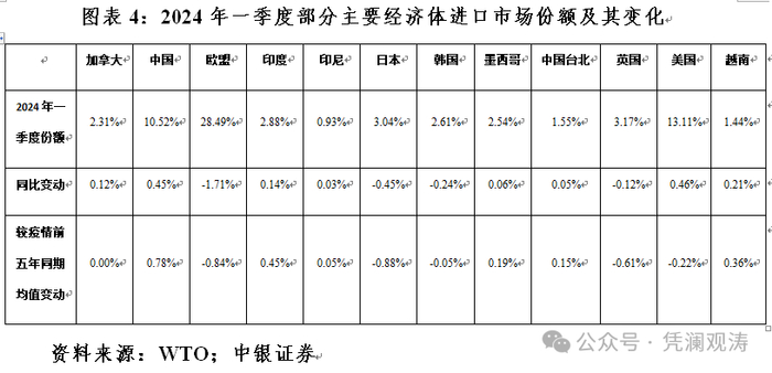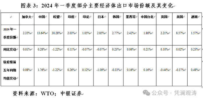 然而,根据WTO公布的最新数据,2024年一季度,中国出口同比增长1.5%,全球出口下降0.6%,中国出口占全球市场份额为13.6%,同比上升0.3个百分点。同期,美国份额仅上升了0.02个百分点,欧盟份额下降了1.2个百分点,受益于近岸贸易、友岸外包的墨西哥、加拿大、印度、韩国、越南、中国台北和日本份额分别上升0.06、0.01、0.1、0.2、0.2、0.2和-0.07个百分点(见图表3)。