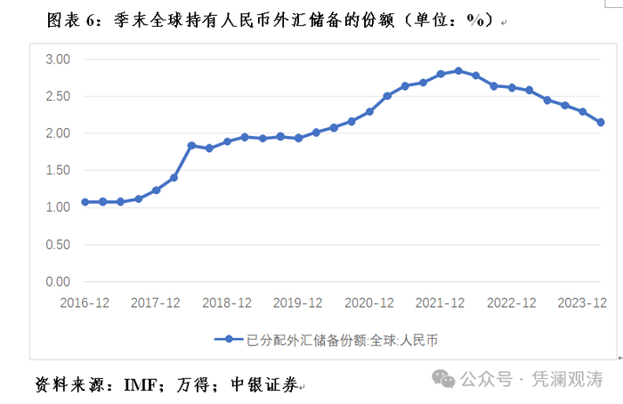 根据IMF的最新统计,截至2024年一季度末,在全球已披露币种构成的外汇储备中,人民币外汇储备占比2.15%,较上年底回落了0.14个百分点;较2022年一季度末的高点回落了0.69个百分点,但较2016年四季度(IMF首次披露全球人民币外汇储备数据)至2019年四季度均值仍高出了0.59个百分点(见图表6)。这再次印证了人民币国际化是一个波浪式发展、曲折式前进的过程。