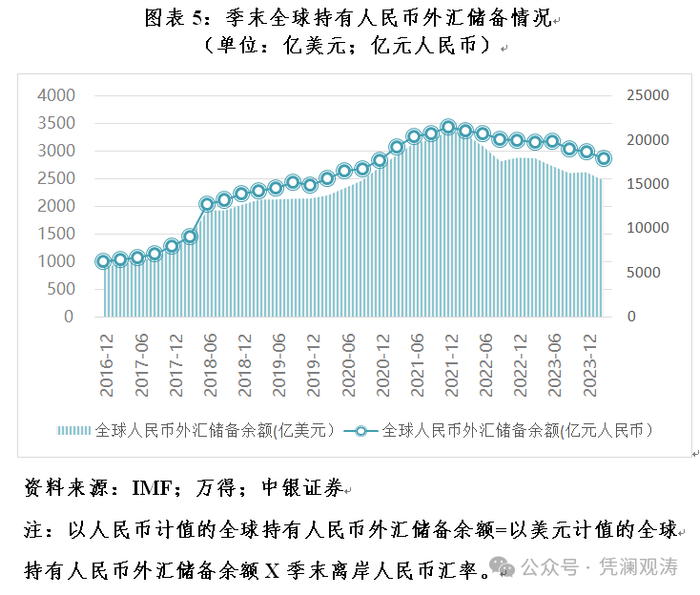 以人民币计,到2024年一季度末,全球持有人民币外汇储备余额17922亿元人民币,较上年底减少749亿元人民币,较2021年底高点减少3543亿元人民币(见图表5)。这既反映了境外外汇储备经营管理机构减持人民币金融资产(主要是人民币国债)的影响,也反映了人民币金融资产价格变化引起的估值效应。