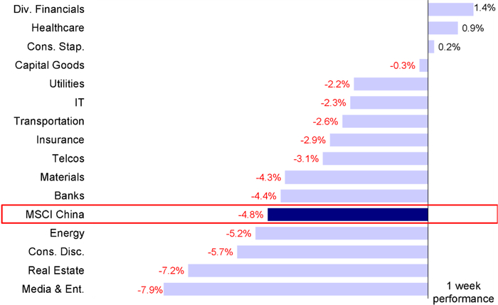过去一周,港股市场受疲弱的经济数据、对后续政策方向尚不明朗的预期,以及外围市场波动等因素共同影响下再度走低,回吐了前一周因为降息乐观预期的涨幅。主要指数中,成长股占比较高的恒生科技指数表现最差,单周下跌6.5%,恒生国企下跌5.6%,恒指与MSCI中国指数也分别下挫4.8%。板块上,媒体娱乐(-7.9%)与房地产(-7.2%)跌幅最大,部分此前领涨的高分红板块如能源(-5.2%)和原材料也明显回调。相比而言,多元金融(+1.4%)与医疗保健(+0.9%)领涨。