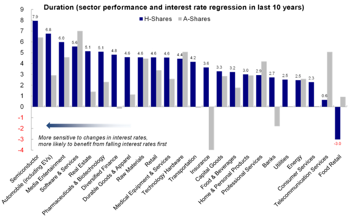 图表:利率下行,久期较长板块如半导体、生物科技、汽车(含新能源)与媒体娱乐等或更为敏感
