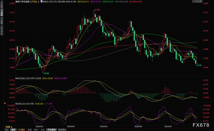 10 年期公债收益率周二下跌 3.1 个基点,报 4.147%,为连续四个交易日下滑,盘中最低触及4.130%,为3月12日以来新低。