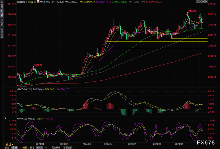 不过,数据显示7 月美国服务业活动从四年最低水平反弹,订单和就业增加。随后,主要股指应声收窄跌幅。金价早些时候再55日均线附近获得支撑,数据出炉后,金价跟随股市反弹。市场仍普遍预计美联储将在9月降息,而且降息50个基点的预期有所升温,仍吸引逢低买盘支撑金价。