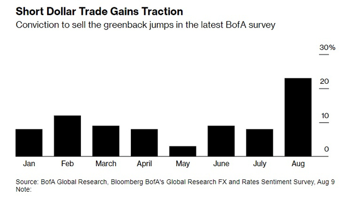 在美国银行最新的月度情绪调查中,约有23%的受访者表示,他们最确信的交易是做空美元,这是今年以来的最高比例,远高于7月的8%。