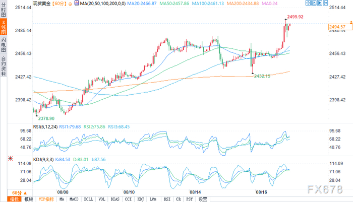 (现货黄金1小时图 来源:易汇通)上周五,现货黄金在向上突破之前的2483.74美元的顶部后飙升至历史新高。反弹止于心理价位2500.00美元。