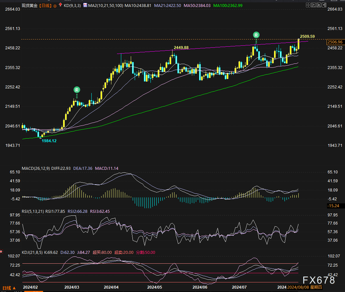 汇通财经APP讯——上周(0812-0816当周),金价收涨3.13%至2506.96美元/盎司,创四个半月(4月初以来)最大周度涨幅。其五天中的一头一尾两根大阳线加中间的小整理行情,最终把行情推高了逾80美元,金价突破原历史新高2483.56并创历史新高至2509.59美元/盎司。