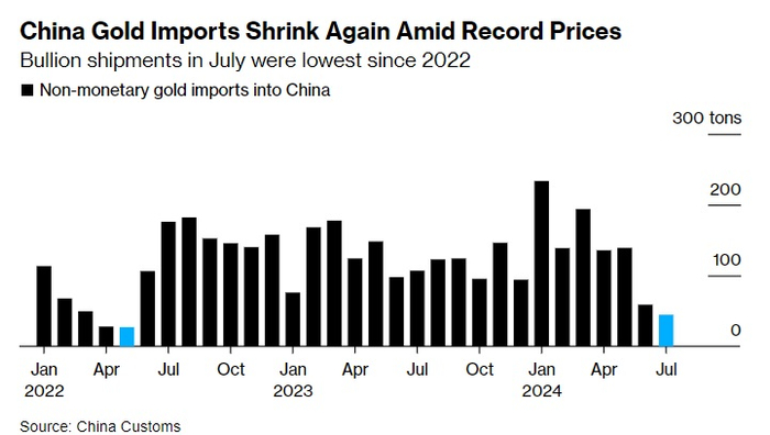 创纪录的金价抑制需求!中国7月份黄金进口量下降24%