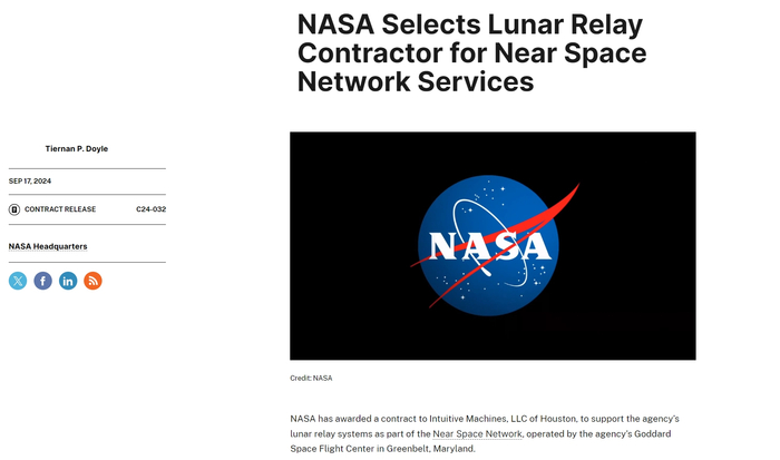 这家美国官方的航空航天机构宣布,直觉机器拿到“近空间网络”(Near Space Network)的合同。作为一项固定价格、多项奖励、无限交付/无限数量的合同,服务期限从今年10月1日开始,持续到2029年9月30日,另外还有延长五年的选项。NASA表示,这份合同的最大潜在价值为48.2亿美元。