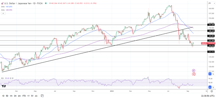 14天RSI为38.60,表明美元/日元跌破141.032支撑位,然后进入超卖区域。