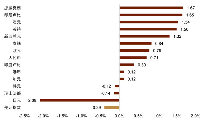 美元指数上周继续在年内低点附近震荡,全周再次收低。美联储以50个基点开启了降息周期,这提振了市场的风险情绪,并使美元处于不利地位。不过,在超预期降息的背景下,美元指数的跌幅很有限,并在年内低点附近呈现了一定的企稳态势。非美货币上周大多走强,市场风险偏好回暖背景下,只有瑞郎和日元上周收跌。其中,BOJ上周议息会议虽然如期按兵不动,但行长对于通胀压力减弱的评论使得市场开始减少对BOJ加息的预期,日元最终大幅收跌2%左右。其余G10货币全线走高,挪威央行上周鹰派维持利率不变,但表示未来降息的时点可能推迟至明年,挪威克朗最终收高1.67%领涨G10货币;英镑上周再次创下年内新高,8月核心通胀数据的走强以及随后英国央行符合市场预期的按兵不动使得市场对其降息的预期推迟至11月,英镑最终收涨1.5%;而欧元则在美元整体走低背景下收高0.8%左右。澳元和新西兰元则在市场风险偏好走高的背景下纷纷收涨1.54%和1.32%;在美元回落的背景下,人民币上周涨至年内新高。