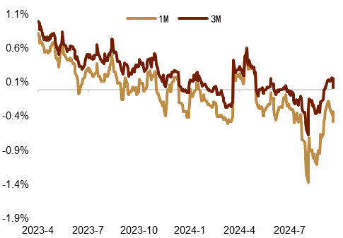 企业结汇意愿或有升温随着汇率预期的向好,企业结汇需求的进一步释放可能是助推人民币汇率升值的重要力量。上周美联储降息幅度超出市场预期,非美货币大多升值。未来中美短端利率趋于收敛的确定性较高,这对汇率预期进一步起到改善作用,RR等衍生品市场指标亦显示汇率预期边际向好(图表3)。我们在此前的报告中指出,若人民币成交量陡升,结汇与购汇力量或趋于失衡,进而增加市场大幅波动的风险。9月19日及20日,人民币成交量分别为539亿美元和481.6亿美元,处于2024年来97%和92%的百分位水平,汇率亦对应升值0.2%和0.22%。我们认为,或是美联储降息的正式落地触发汇率预期的改善,并使得企业结汇需求继续释放,推升人民币汇率连续6日的走强。