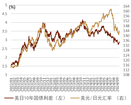 风险追逐情绪+日本央行偏鸽=日元成为最弱货币 上周市场整体风险追逐情绪(Risk on)较强,日元、瑞士法郎、美元这三大避险货币表现疲软,美元指数已经连续三周下跌。上述背景之外,日元也有自身的走弱因素,上周全周日元相较美元贬值2.09%,成为了最弱亚洲与最弱G10货币。虽然上周五日本央行鸽派的会后记者招待会带来了日元的明显贬值,但其实在日本央行开会之前的周一至周四期间日元也发生了明显的贬值,让我们仿佛看到了今年上半年的日元行情,我们感觉风险情绪对日元汇率的影响很大。上周美日汇率与美元指数联动较低,但是同美国10年利率高度联动(图表10、图表11)。息差方面,美日汇率与美日10年息差、美日汇率12个月掉期点在上周同方向波动(图表12、图表13)。此外,截至9月17日(周二)投机资金对日元的头寸与此前一周基本持平(图表14),反映出投机性资金对日元或持有观望的态度。