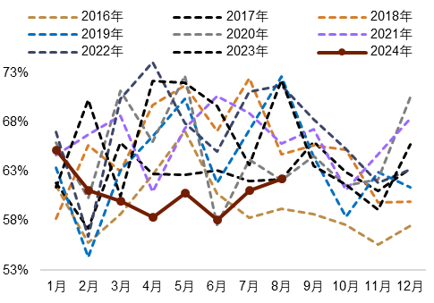 ►银行代客结售汇方面,8月顺差9.1亿美元,各个项目均有改善,主要源于售汇的减少。8月售汇减少418.1亿美元,贡献了结售汇顺差变动的89.8%。结汇率环比小幅走高1.2个百分点至62.2%,依然处于近年来历史同期的偏低水平(图表4),企业结汇意愿仍有待进一步恢复。银行代客远期净结汇及代客远期净结汇累计未到期额变动均环比明显增长,结汇增加与售汇减少的贡献相近,8月分别为134.6亿美元和111.6亿美元,处于近两年较高水平(图表5)。