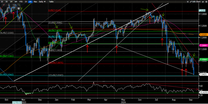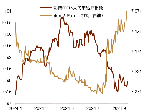 ► 上周(9/16~9/20):上周美元指数走低,美债收益率则有所反弹,国内结汇盘或有释放,人民币对美元录得明显升幅。具体来看,上周美联储议息会议降息50基点,不过美债及美元指数反应相对温和。在美联储政策立场改变的背景下,人民币汇率预期或进一步向好,并导致部分结汇盘的松动,人民币汇率录得明显升值。