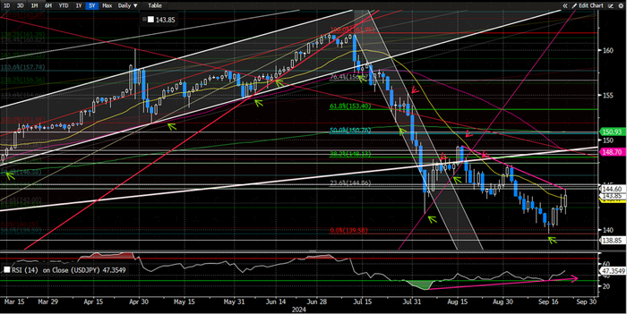 美元/日元上周如期在140附近找到支撑之后一路走高至我们的第一看涨目标144.60附近,并且最终收盘于21天均线143.50上方。向前看,美元多头能否守住21天均线附近支撑可能会决定价格未来走势,考虑到RSI指数自8月以来走出上升趋势,短期内美元/日元可能会迎来进一步的反弹,尤其如果美元多头可以继续向上突破8月中旬以来的下行趋势阻力(图表19中粉色下行趋势线段),38.2%斐波那契回撤位148附近可能是美元多头下一个目标而140附近则可能继续提供近期关键的支撑。
