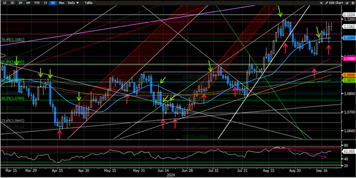 欧元/美元上周在21天均线附近找到支撑后一度上行至年内高点1.12下方附近,但上周五上升动能有所放缓最终并未能突破年内高点1.12附近阻力。向前看,欧元多头能否继续守住21天均线这一关键的近期支撑可能会决定欧元短期内的走势(图表18中蓝色线&最右侧红色箭头),如果欧元多头可以守住这一近期支撑,那么前期年内高点1.1200附近可能成为欧元多头下一个目标。但如果欧元多头未能突破年内高点1.12甚至跌破21天均线,那么价格可能会面临回撤风险,55天均线1.0990附近可能会给欧元提供较强的支撑。