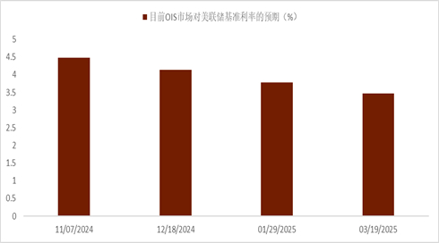9月FOMC会议降息50个基点开启降息周期 暗示年内再降50基点 上周美联储如期开启降息周期,但50基点的降息幅度多少令市场有些意外。美联储票委中有一人反对降息50基点,鲍曼支持降25基点,这也是2005年以来首位投反对票的美联储官员。会议决议声明中表示[4] “美联储坚定致力于支持充分就业,并且对通胀降至目标更有信心。而就业增速已经放缓,失业率有所上升但仍保持在低位。”美联储目前认为“就业和通胀的风险大体均衡,在考虑未来降息时将评估经济数据,经济前景和风险均衡”。而最新点阵图显示[5],超过半数的决策者预计(19位票委中有10位),今年剩余的两次会议上美联储至少每次降息25个基点。而美联储今年利率预期中位数则从上次的5.125%降至4.375%,2025年的利率中位数从4.125%降至3.375%,后年的利率预期中位数也从3.125%降至2.875%。经济增长和通胀预测方面,美联储小幅下调今年GDP增速预期至2.0%(6月预期为2.1%),PCE和核心PCE通胀预期小幅下调至2.3%和2.6%(6月预期是2.6%和2.8%),但大幅上调今年和明年的失业率预期至4.4%(6月预期分别是4.0%和4.2%)。发布会上鲍威尔试图中和大幅降息50基点给市场带来的鸽派解读,他多次强调[6]FOMC未来将不会急于求成,将循序渐进的“重新校准”货币政策立场,而对未来的利率路径美联储依旧会逐次会议的做出决定,并没有预设的路径。本次FOMC会后,OIS市场对年内降息总量的预期维持在70基点左右(图表8)。