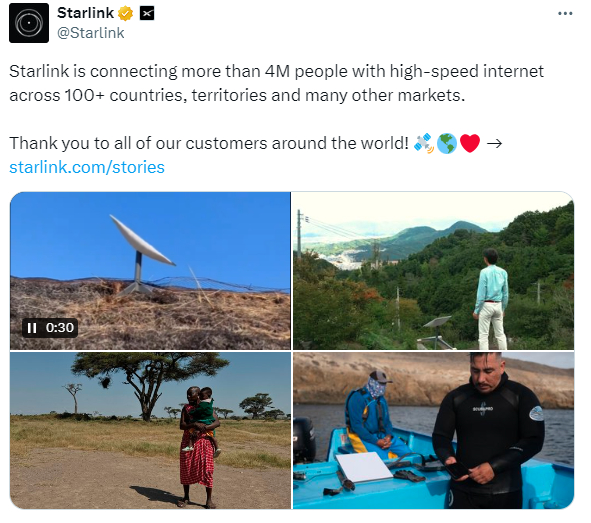 《科创板日报》9月27日讯(编辑 宋子乔) 当地时间9月27日,SpaceX的星链(Starlink)部门宣布,其全球用户数量突破400万,“Starlink 为100 多个国家、地区和许多其他市场的400多万人提供高速互联网连接,感谢我们全球的所有客户!”
