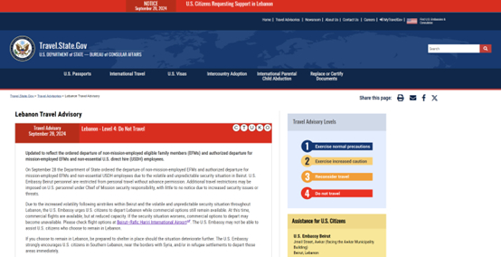 中东局势升级!美国更新黎巴嫩旅行警告 再次呼吁其公民离开