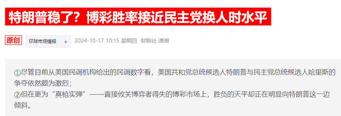 财联社10月22日讯(编辑 潇湘)过去几周,在民调数字变动不大的背景下,博彩市场上围绕特朗普胜选的概率却一路飙升,这在很大程度上也激发了金融市场上“特朗普交易”的全面兴起。然而,若细细观察一些平台的资金动向,一切似乎并没有那么简单……