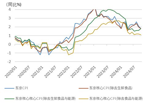 东京CPI显示核心通胀压力仍在 上周五公布了10月东京CPI的结果,综合CPI同比为1.8%(前值2.1%)、除去生鲜食品CPI同比为1.8%(前值为2.0%)、除去生鲜食品与能源的CPI同比为1.8%(前值为1.6%)、除去食品与能源的CPI同比1.1%(前值为1.2%)。综合CPI与除去生鲜食品CPI同比的降低主要来自于政府的相关补贴带来的政策性降价,但是偏核心部分的CPI同比并未出现弱化(图表20)。10月是日本重要的涨价窗口期,反映出企业对该年春季涨薪后的成本转嫁,24年10月东京的除去生鲜食品与能源的CPI环比为0.5%、高于去年同期的0.3%,我们认为今年10月的成本转嫁的成果明显,未来日本的通胀或仍会持续。