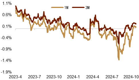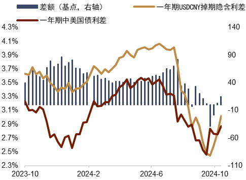 稳汇率政策或有发力 近期内外部环境压力或有抬升,不过人民币汇率预期趋于稳定,我们认为主因或在于稳汇率政策有所发力,促使外汇市场预期平稳。彭博报导称[9],多位交易员反馈称中资大行近一周以来在境内即期市场上不时卖出美元,并在掉期市场进行近端融入美元、远端融出美元的操作。本周来中资大行在远端卖出美元的量增加,尤其是1年期品种,带动掉期曲线快速下行。我们亦发现近期掉期点走低的速率较高,12M掉期的隐含收益率已高于同期限中美国债利差水平,或显示稳汇率政策重新发力(图表8)。我们认为在此前的报告指出,汇率预期稳定的重要性或高于某一个具体点位的得失。10月以来,RR等衍生品市场指标显示汇率预期持续走弱,然而或是在近期稳汇率政策呵护下,汇率预期出现企稳迹象(图表9)。往后看,我们认为央行或继续对汇率预期有所关注,若内外部压力持续,稳汇率政策或有望对应发力。