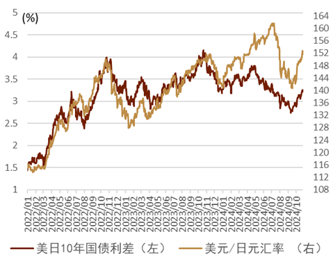 强美元弱日元 上周外汇市场继续在“特朗普交易”的背景下美元整体走强,成为了最强G10货币。美元走强的同时,日元还因政治不确定性等因素上周相较美元贬值1.83%,成为了上周最弱的G10、亚洲货币。整体来看,美日汇率在上周同美债利率、美元指数的走势都相对贴近(图表15、图表16),反映出“特朗普交易”的特征。息差方面来看,过去一周美国的利率仍在提高(图表17、图表18),在息差扩大背景下日元进一步贬值。此外,截至10月22日(周二)投机资金对日元的头寸依旧处于中立位置,对日元更多是观望态度(图表19)。