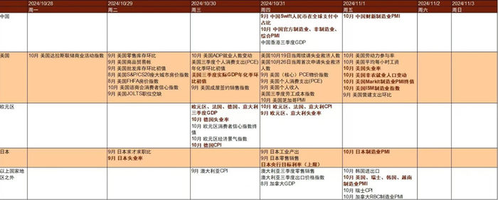► 本周(10/28~11/1):本周美国将公布9月PCE价格指数,10月ADP、非农等就业数据及ISM制造业PMI等重要经济数据,中国则将公布10月制造业及服务业PMI。迈向11月,我们认为需继续关注“特朗普交易”以及对中国财政刺激预期的变化,在稳汇率政策支持下,短期内人民币汇率波动或趋于稳定,下跌空间或有限。