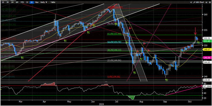 美元/日元上周向上突破并且收盘在200天均线151.40附近之上。向前看,美元多头能否继续向上突破61.8%斐波那契回撤位153.40附近阻力可能会决定价格未来走势。考虑到RSI指数自9月中旬以来的上升趋势依旧有效,短期内美元/日元可能会继续维持在高位,但需尤其关注200天均线附近151.40附近的关键支撑(图24中绿色线&最右侧绿色箭头),如果美元多头失守这一关键位置,价格可能面临快速回调的风险。我们认为美元/日元继续上行的空间比较有限,投资者需警惕价格回撤的风险。