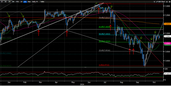 美元/人民币上周围绕50%斐波那契回撤位7.14附近小幅震荡走高;向前看,7.14附近可能会继续提供近期阻力(图22中最右侧绿色箭头),而近期关键支撑依旧位于50天均线7.09附近(图22中粉色线),我们认为如果美元多头失守这一关键支撑,那么价格可能会迎来更大幅度的回撤。本周美元/人民币可能会继续维持小幅震荡的行情。